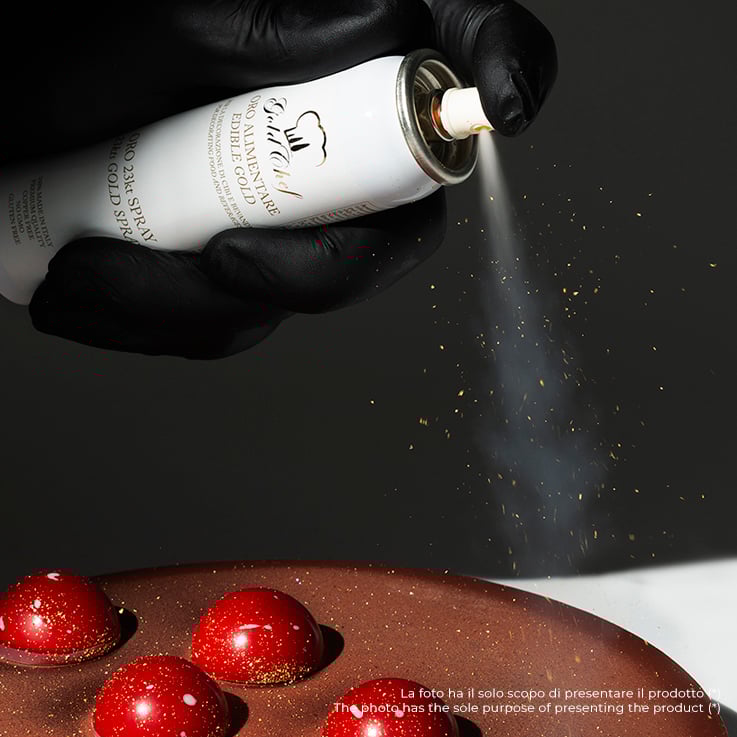 The preciousness of 100 mg and 200 mg of very fine 23K edible gold powder and the extreme ease of a spray: the new 23K edible gold spray by Gold Chef is Made in Italy, biologically inert, tasteless and undetectable to the palate