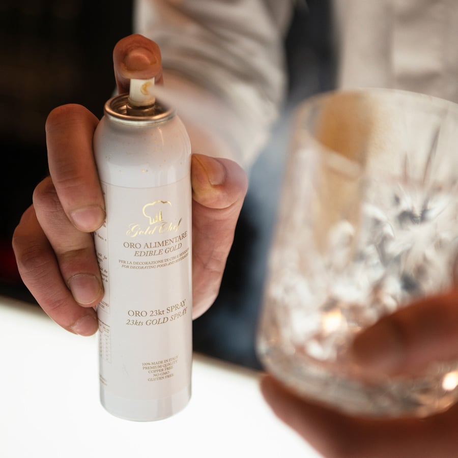 - spray: Our edible gold spray is ideal for practical decorations, which can be quickly created but will leave guests speechless! A sprinkle along the glass will make your cocktail a creation of incredible charm, elevating even the most classic Gin & Tonic.