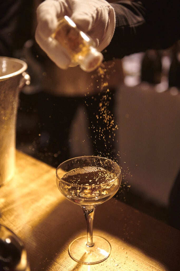 A Christmas eve toast could be a simple prosecco garnished with a lot of gold powder, an aperitif before Christmas lunch could be adorned with a splash of light throughout the glass and December 31 celebrations could be tinged with gold as a good omen for the coming year.