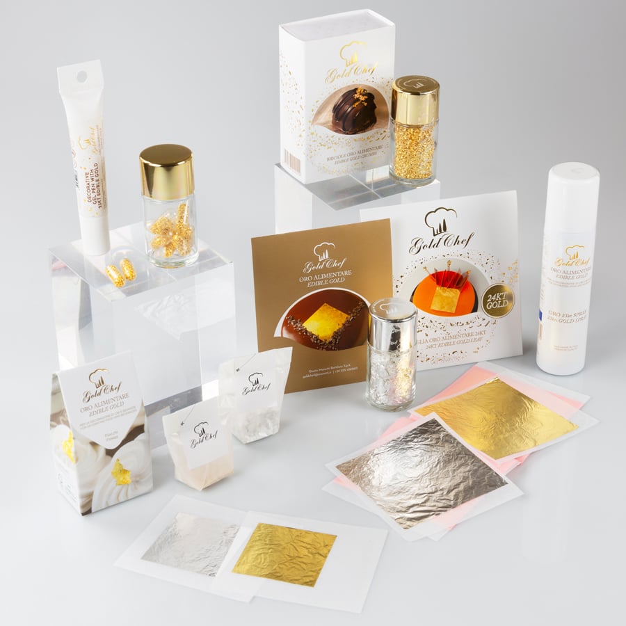– Spaghetti alla chitarra con panna acida e argento: non semplici spaghetti, non solo oro. Con Gold Chef potete impreziosire i vostri piatti anche con la polvere di argento alimentare!– Sfera di cioccolato con crema al mascarpone e oro: un dessert che concentra in un boccone i sapori più golosi della pasticceria, con quel tocco di preziosità in più donato dalla nostra foglia in oro alimentare 23kt.